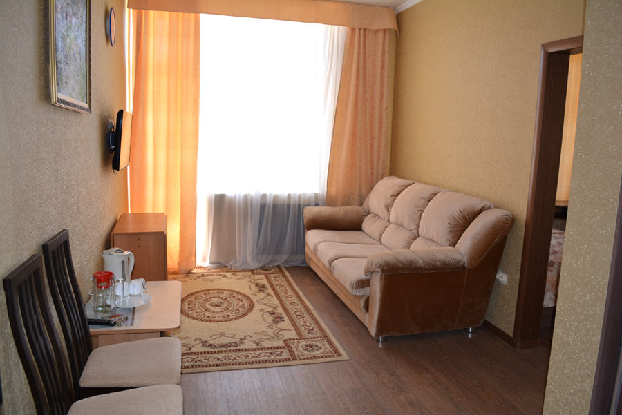 Двухкомнатный номер предназначен для комфортного размещения гостя, где предусмотрено всё для самостоятельного перемещения на коляске по номеру. Комната оборудована необходимой мебелью. В номере имеется гостиная, спальня, специализированный санузел, балкон. Для гостей, проживающих в номере, предусмотрено питание в зале питания по системе шведский стол.